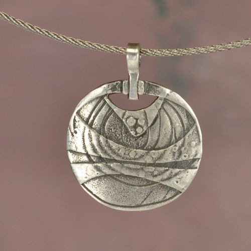 Dieser silberne Anhänger hat 30 mm Durchmesser. Das Dekor aus Linien und Flächen erinnert mich an Landschaft mit Meer, Sonne und Horizont.