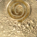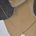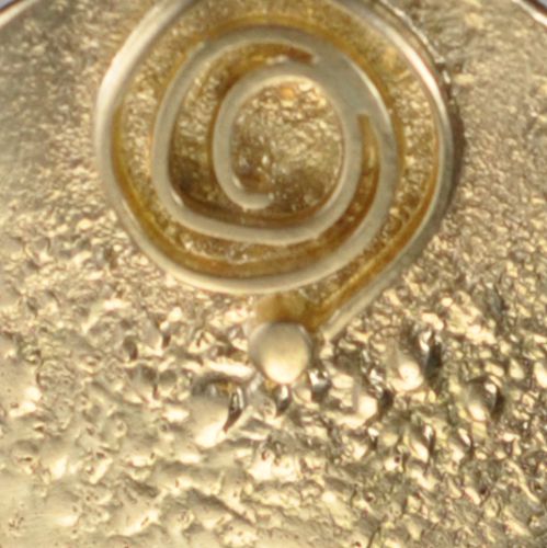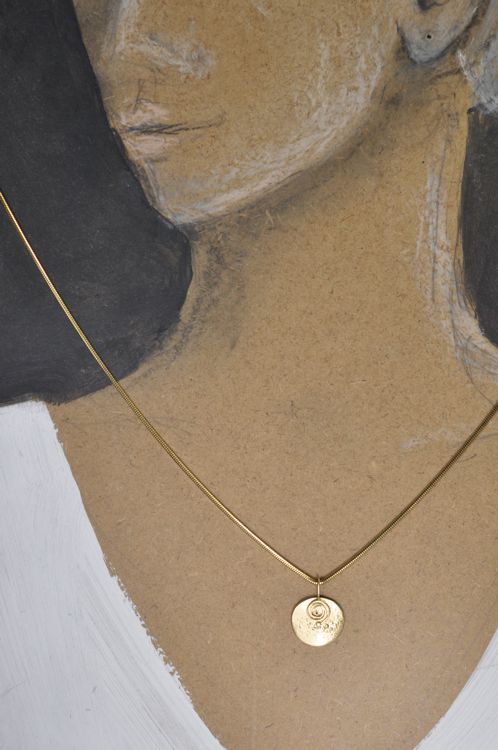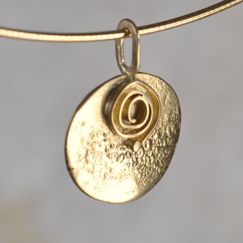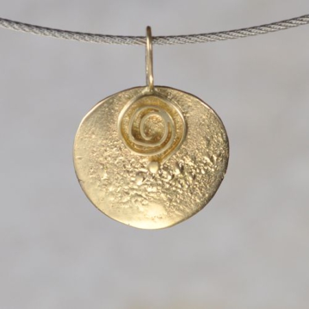Fast rund ist dieser Anhänger aus 750er Gelbgold. Die aufgelegte Spirale steht in schönem Kontrast zur rauhen Oberfläche. Er hat ca 18 mm Durchmesser.