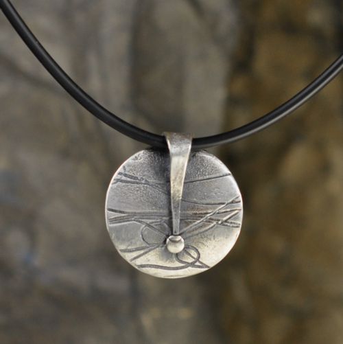 Hier ist die Aufhängung Teil der Gestaltung (mach ich oft und gerne). Eine spitz zulaufende Lasche legt sich über den Schmuck und endet in einem Punkt. Der Anhänger ist kreisrund, wie die Lasche leicht gewölbt und hat 23,5 mm Durchmesser.