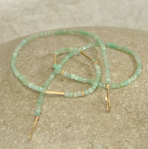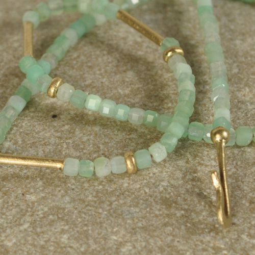 Frisches Grün. Kleine blitzenden Chrysopras-Würfelchen (2,5 mm) kombiniert mit Gold. Das Collier ist 45 cm lang.