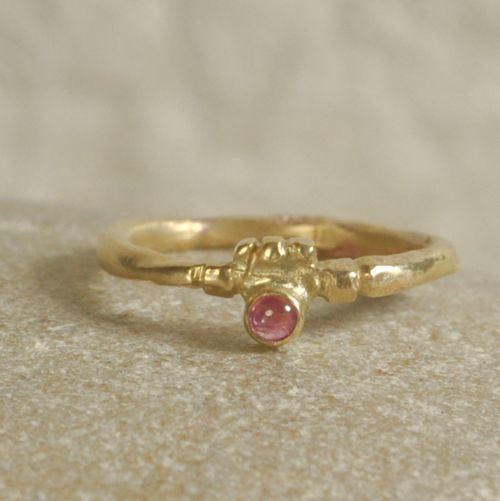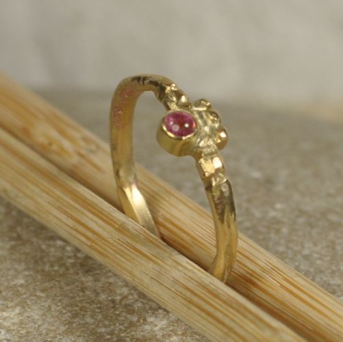 Turmaline kommen in vielen verschiedenen Farben vor. Sie waren bereits im Mittelalter beliebte Schmucksteine. Für diesen feinen Goldring habe ich eine rosa Variante ausgesucht. Der Stein hat 3 mm Durchmesser. Die Ringschiene ist unregelmäßig und zwischen 1,5 und 2,5 mm breit.